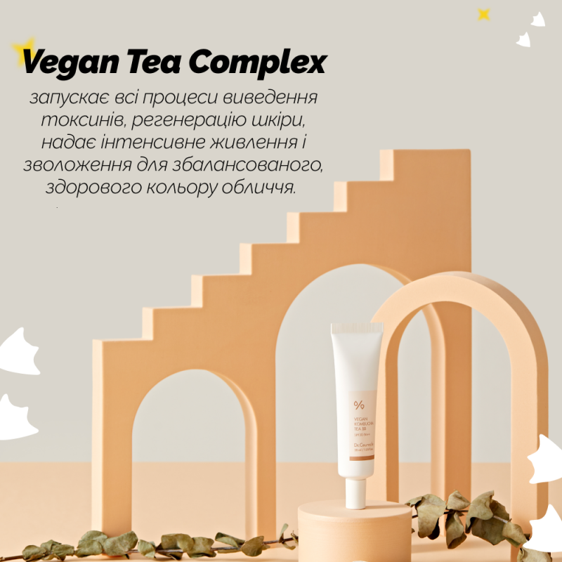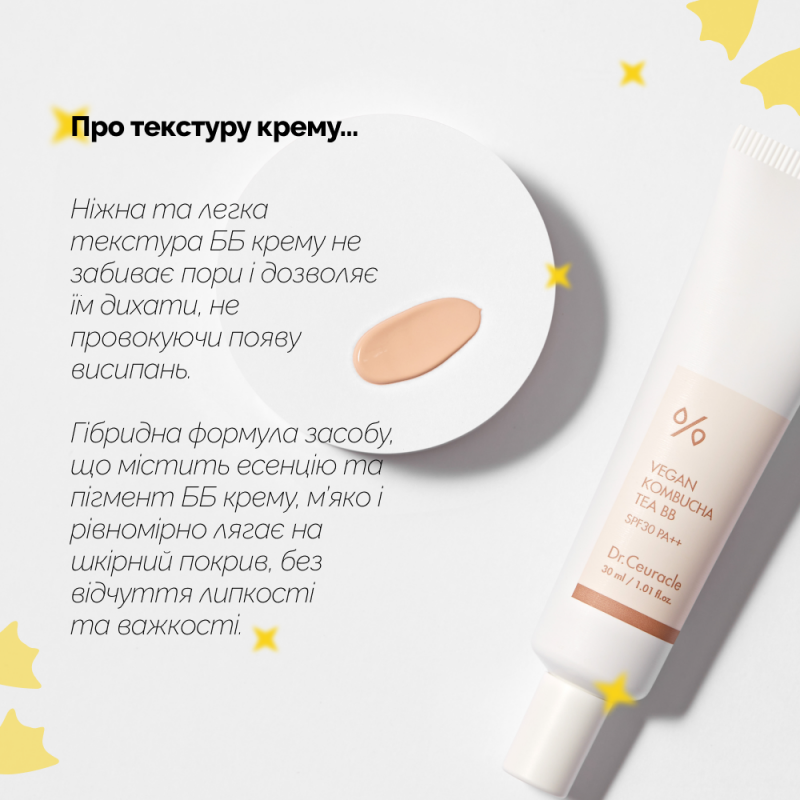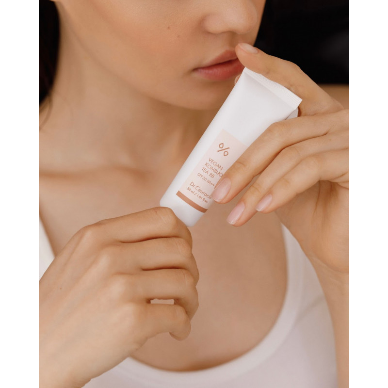 В основе усовершенствованного бб крема Dr.Ceuracle Vegan Kombucha Tea BB Cream – ферментированный черный чай, содержащий большое количество пробиотиков, витамина В и разнообразных питательных веществ, что увлажняет и питает лицо, а также защищает от воздействия ультрафиолета (spf 30 pa++).