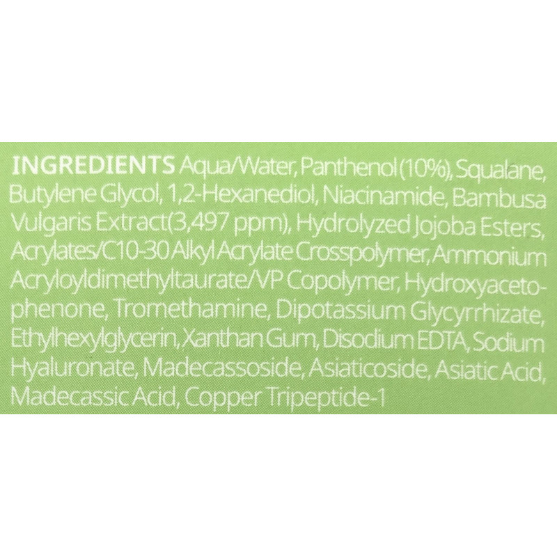 Water, Panthenol (10%), Squalane, Butylene Glycol, 1,2-Hexanediol, Niacinamide, Bambusa Vulgaris Extract (3,497 ppm), Hydrolyzed Jojoba Esters, Acrylates/C10-30 Alkyl Acrylate Crosspolymer, Ammonium Acryloyldimethyl Taurate/VP Copolymer, Hydroxyacetophenone, Tromethamine, Dipotassium Glycyrrhizate, Ethylhexylglycerin, Xanthan Gum, Disodium EDTA, Sodium Hyaluronate, Madecassoside, Asiaticoside, Asiatic Acid, Madecasic Acid, Copper Tripeptide-1.