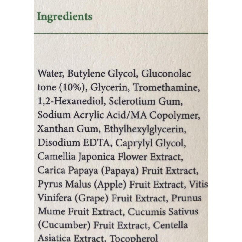 - Глюконолактон (10%) - относится к новому поколению гидроксикислот, которые оказывают во многом аналогичное АНА-кислотам биологическое действие, однако имеют ряд преимуществ. Глюконолактон является природным антиоксидантом, по своей активности сравним с аскорбиновой кислотой и токоферолом. Основные экспериментально доказанные свойства: защищает эластиновые и коллагеновые волокна, обеспечивает высокий уровень антиоксидантной защиты, увлажняет кожу, выравнивает ее цвет и рельеф, обладает противовоспалительным эффектом, регулирует процесс естественной кератинизации кожи, отшелушивает омертвевшие участки кожи.