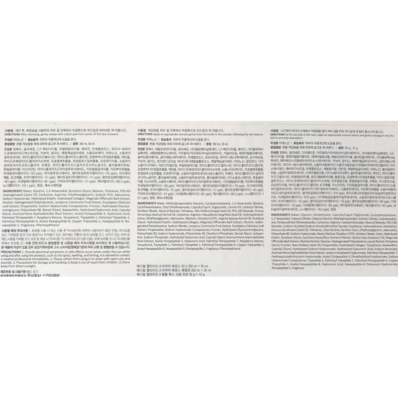 Формулы всех уходовых средств включают в себя такие увлажняющие и омолаживающие компоненты, как пептиды (9 видов), гиалуроновая кислота, аденозин.