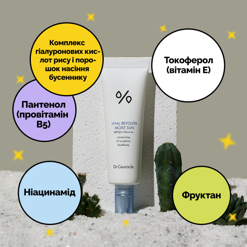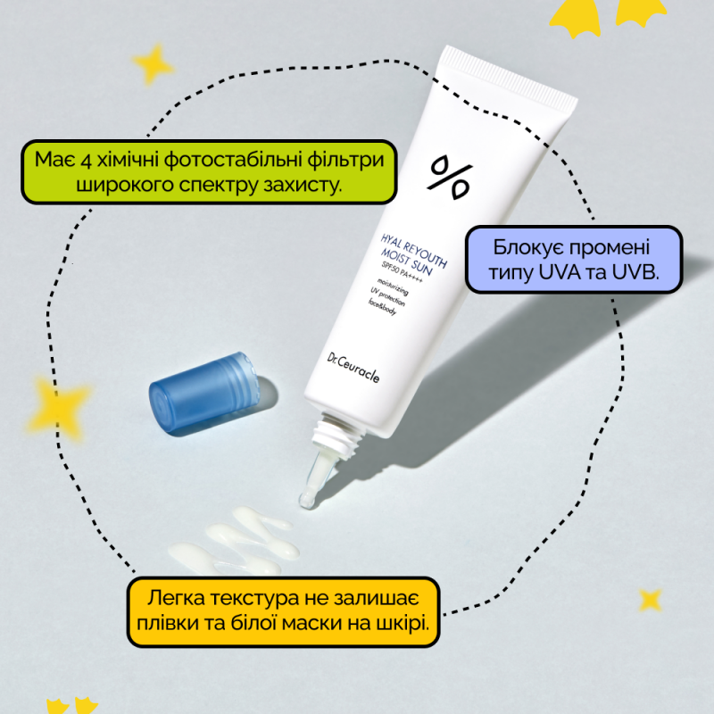 Легкая текстура крема Dr.Ceuracle Hyal Reyouth Moist Sun (по консистенции напоминает эмульсию) быстро впитывается, не оставляя ощущения липкости или жирности. Специальные солнцезащитные фильтры SPF 50 / PA++++ обеспечивают мощную защиту от ультрафиолетовых лучей и помогают предотвратить фотостарение кожи.