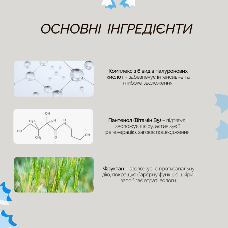 - комплекс гиалуроновых кислот – обеспечивает интенсивное глубокое увлажнение;