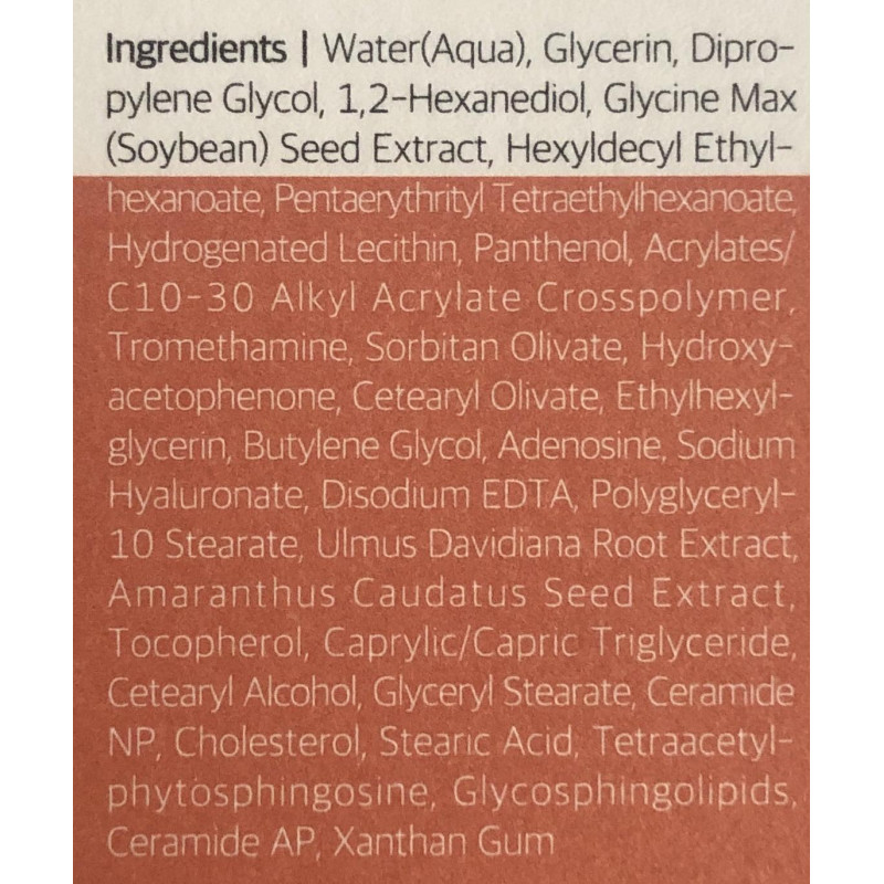 Вода, глицерин, дипропилен гликол, 1,2-хексанедиол, глицин макс (Соибъян) Seed Extract (10,032 ppm), Panthenol (2,550 ppm), Ceramide AP, Ceramide NP, Stearic Acid, Cholesterol, Ulmus David Extract, Hydrogenated Lecithin, Sodium Hyaluronate, Pentaerythrityl Tetraethylhexanoate, Hexyldecyl Ethylhexanoate, Acrylates/C10-30 Alkyl Acrylate Crosspolymer, Cetearyl Olivate, Sorbitan Olivate, Tromethamine, Butylene Stearate, Caprylic/Capric Triglyceride, Glycosphingolipids , Glyceryl Stearate, Cetearyl Alcohol, Xanthan Gum, Tetraacetylphytosphingosine, Ethylhexylglycerin, Hydroxyacetophenone