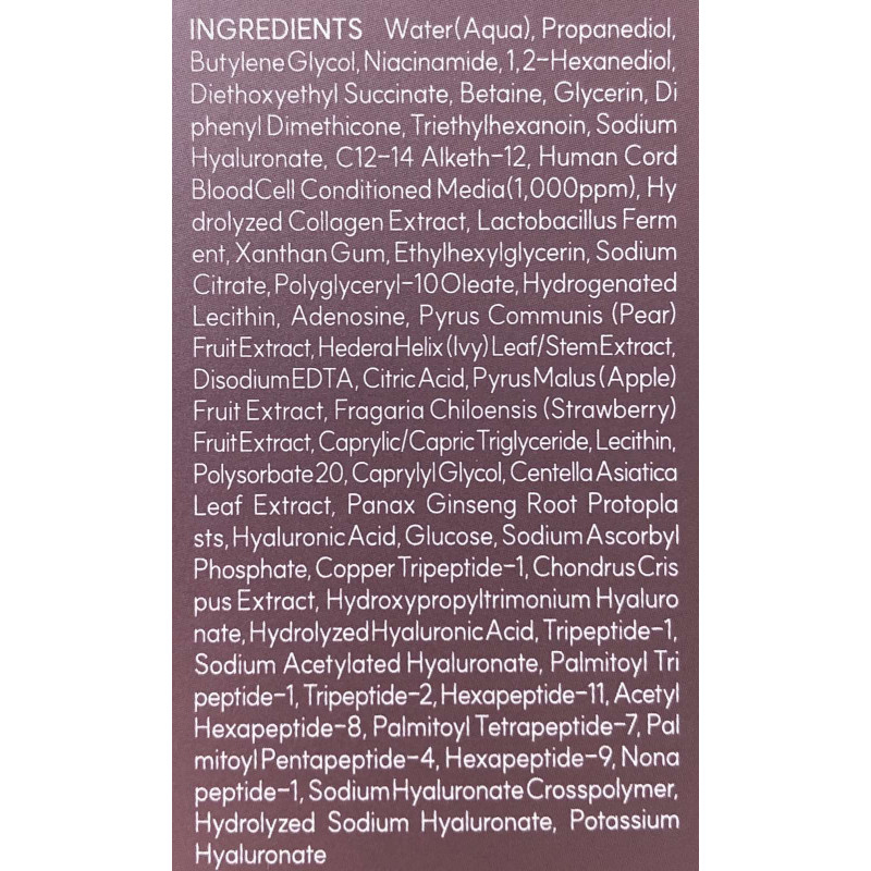 В состав средства входят ультранизкомолекулярный морской коллаген, экзосомы женьшеня, 10 пептидов, гиалуроновая кислота и культуральный раствор стволовых клеток человека. Такое мощное сочетание активных ингредиентов работает на глубоком уровне, чтобы ваша кожа оставалась здоровой, упругой и молодой в течение долгого времени.