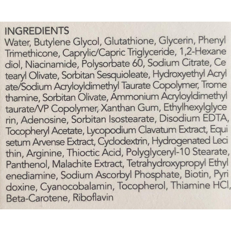 Формула содержит высокую концентрацию глутатиона (≈6 %) — мощного антиоксиданта, а также ниацинамида, альфа-липоевой кислоты, малахита, витаминов и увлажняющих компонентов.