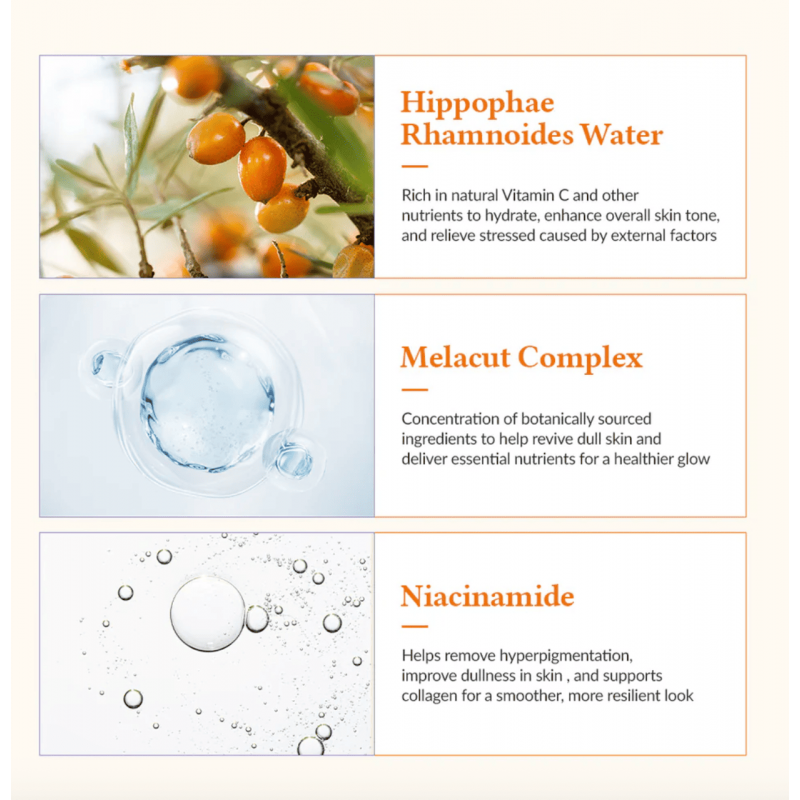 Aqua, Glycerin, Hippophae Rhamnoides Water (50,960 ppm), Niacinamide, Butylene Glycol, 1,2-Hexanediol, Methyl Gluceth-20, Polyglyceryl-10 Laurate, Arginine, Carbomer, Allantoin, Ethylhexylglycerin, Adenosine, Melia Azadirachta Flower Extract, Ocimum Sanctum Leaf Extract, Disodium EDTA, Melia Azadirachta Leaf Extract, Curcuma Longa (Turmeric) Root Extract, Corallina Officinalis Extract, Portulaca Oleracea Extract, Vitis Vinifera (Grape) Seed Extract, Saururus Chinensis Extract, Rice Ferment Filtrate (Sake).