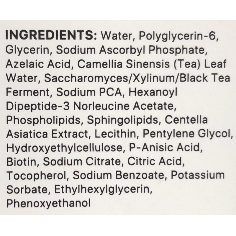 Комплекс зеленого и черного чая обеспечивает антиоксидантную защиту, успокаивает кожу и помогает регулировать выработку кожного сала. Он также содержит пептид нового поколения, стимулирующий обновление клеток и обеспечивающий нежный пилинг для заметного улучшения текстуры.