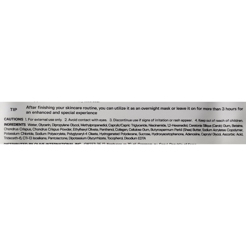 Формулу доповнюють колаген та олія ши, які надають засобу зволожувальну, живильну та захисну дію. Після застосування маски шкіра стає освітленою, зволоженою, розгладженою та підтягнутою. Продукт не містить ароматизаторів і підходить для чутливої шкіри.