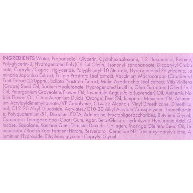 - ресвератрол, що в природньому вигляді міститься в червоному винограді, має високу антиоксидантну активність для протидії пошкоджень вільними радикалами, посилює здатність шкіри до самовідновлення, зменшує візуальні прояви передчасного старіння, стимулює синтез фібробластів, покращує еластичність та пружність, вирівнює тон шкіри;