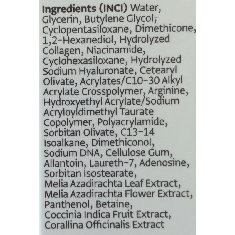 - гідролізований колаген у концентрації 20 000 ppm - активно відновлює пружність шкіри, надає їй еластичності та пружності, а також забезпечує глибоке зволоження, допомагаючи зберігати щільність і гладкість;
