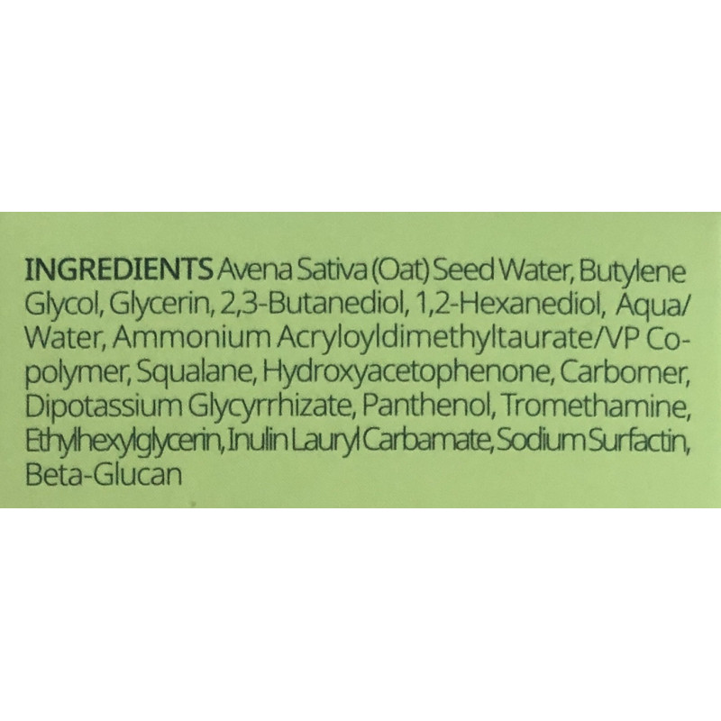 - Вода з насіння вівса (77%) — багатий антиоксидантами та зволожувальними властивостями компонент, допомагає підтримувати водний бар’єр шкіри.