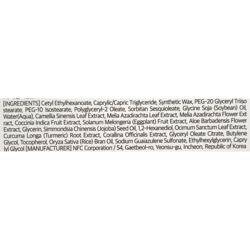 Рослинні екстракти, такі як від зеленого чаю, баклажана й листя німу, заспокоюють подразнення та запалення. Від тепла шкіри засіб перетворюється на ніжну очищувальну олію, а при контакті з водою утворює молочну емульсію, яка легко змивається водою. Продукт веганський.