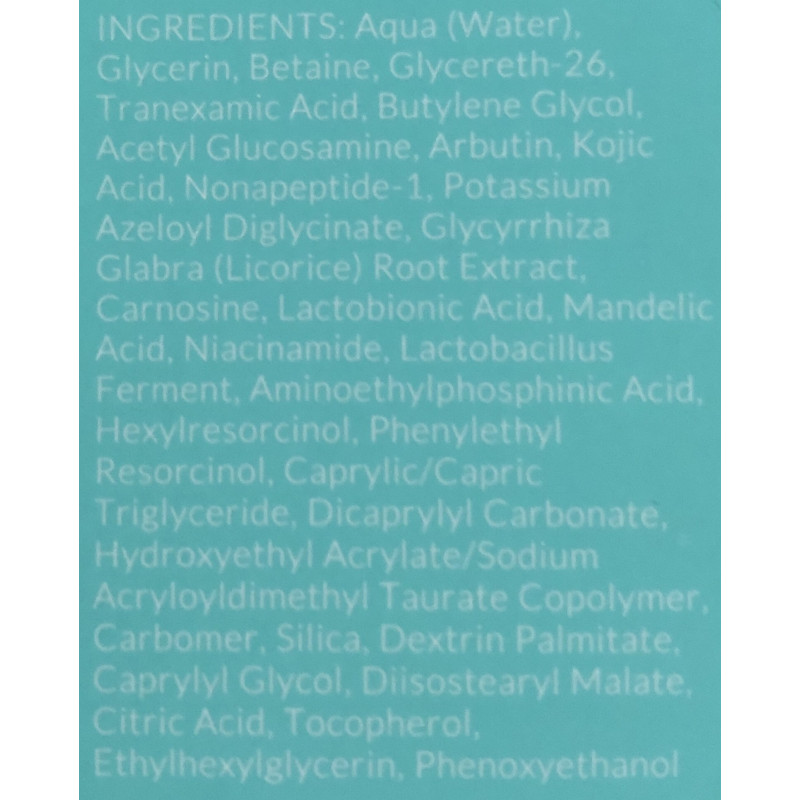 Aqua (Water), Glycerin, Betaine, Glycereth-26, Tranexamic Acid, Butylene Glycol, Acetyl Glucosamine, Arbutin, Kojic Acid, Nonapeptide-1, Potassium Azeloyl Diglycinate, Glycyrrhiza Glabra (Licorice) Root Extract, Carnosine, Lactobionic Acid, Mandelic Acid, Niacinamide, Lactobacillus Ferment, Aminoethylphosphinic Acid, Hexylresorcinol, Phenylethyl Resorcinol, Caprylic/Capric Triglyceride, Dicaprylyl Carbonate, Hydroxyethyl Acrylate/Sodium Acryloyldimethyl Taurate Copolymer, Carbomer, Silica, Dextrin Palmitate, Caprylyl Glycol, Diisostearyl Malate, Citric Acid, Tocopherol, Ethylhexylglycerin, Phenoxyethanol