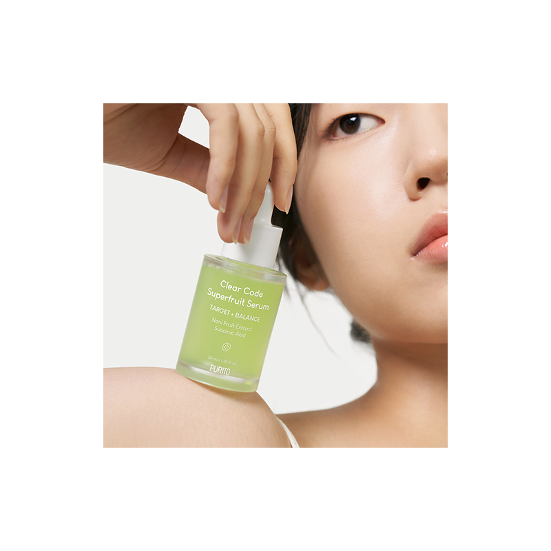 Purito Clear Code Superfruit Serum – це легка сироватка, створена для балансування мікробіому шкіри та регулювання себуму, забезпечуючи заспокійливий ефект для проблемної та чутливої шкіри. Формула, збагачена екстрактом плоду ноні та бурштиновою кислотою, сприяє зменшенню почервонінь, відновлює бар'єр шкіри та контролює жирність, роблячи її здоровою та сяючою.