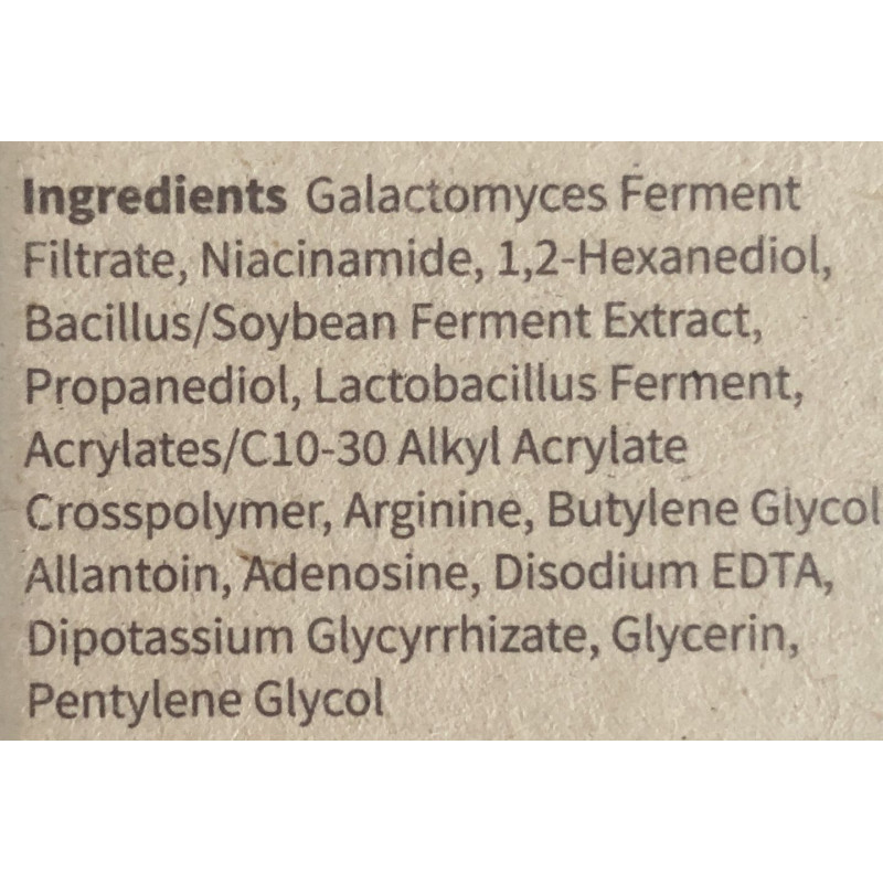 Galactomyces Ferment Filtrate (92%), Niacinamide (5%), 1,2-Hexanediol, Bacillus/Soy Ferment Extract, Propanediol, Lactobacillus Ferment, Acrylates/C10-30 Alkyl Acrylate Crosspolymer, Arginine, Butylene Glycol, Allantoin, Adenosine, Disodium EDTA, Dipotassium Glycyrrhizate, Glycerin, Pentylene Glycol.