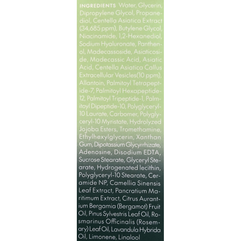 Продукт містить в своєму складі 49% екстракту центели азіатської, колаген, кераміди і комплекс пептидів. Всі ці компоненти ефективно впливають на епідерміс – нормалізують водно-жировий баланс, зміцнюють захисні функції і ліпідний бар’єр, м’яко освітлюють і покращують колір обличчя, омолоджують і проводять зволоження на глибокі шари шкіри.